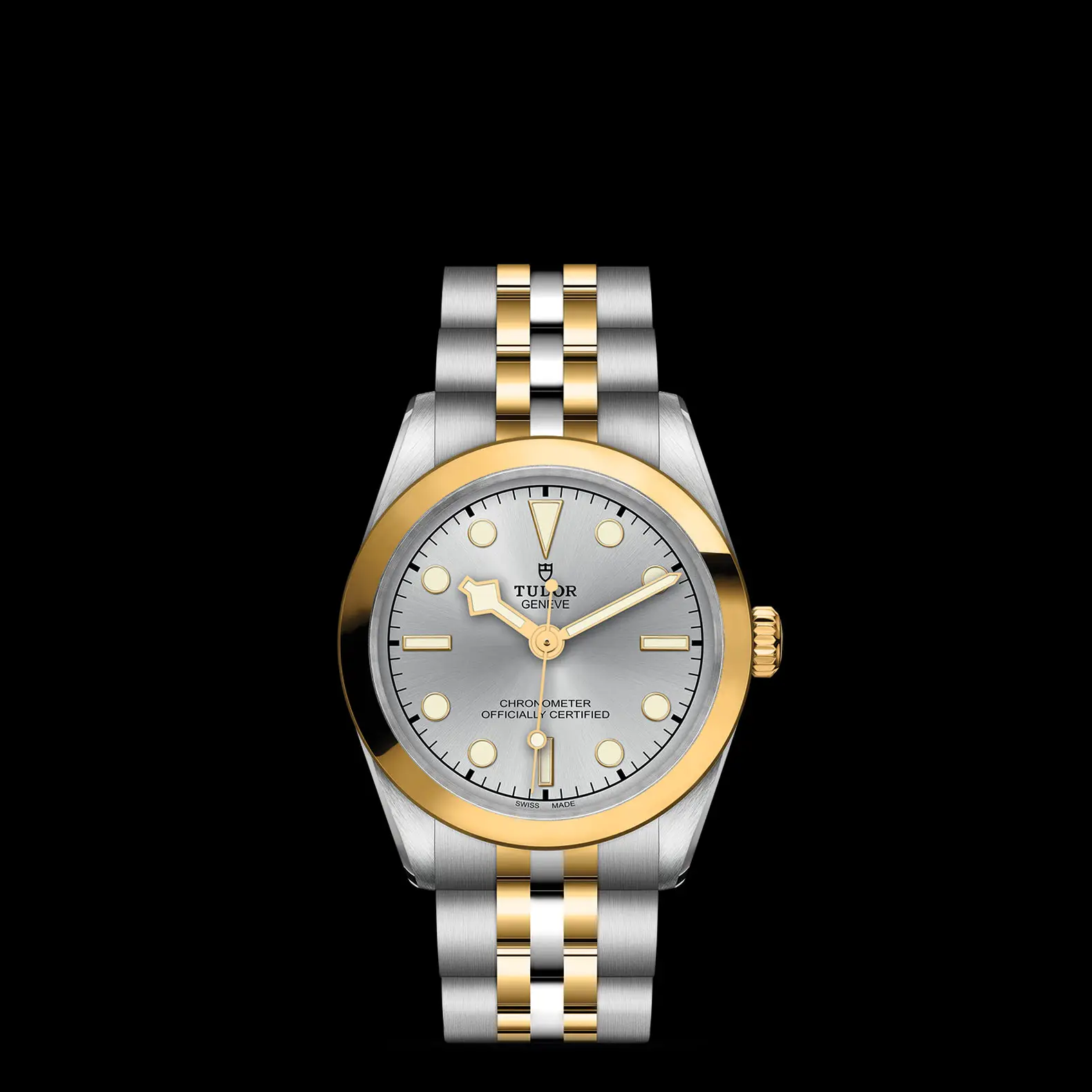 Primeros eslabones centrales de acero o de oro amarillo macizo. Los demás eslabones centrales son de acero o de acero recubierto de 0,2 mm de oro amarillo. Cierre desplegable TUDOR «T‑fit» con cierre de seguridad. El logo del cierre es de oro amarillo macizo