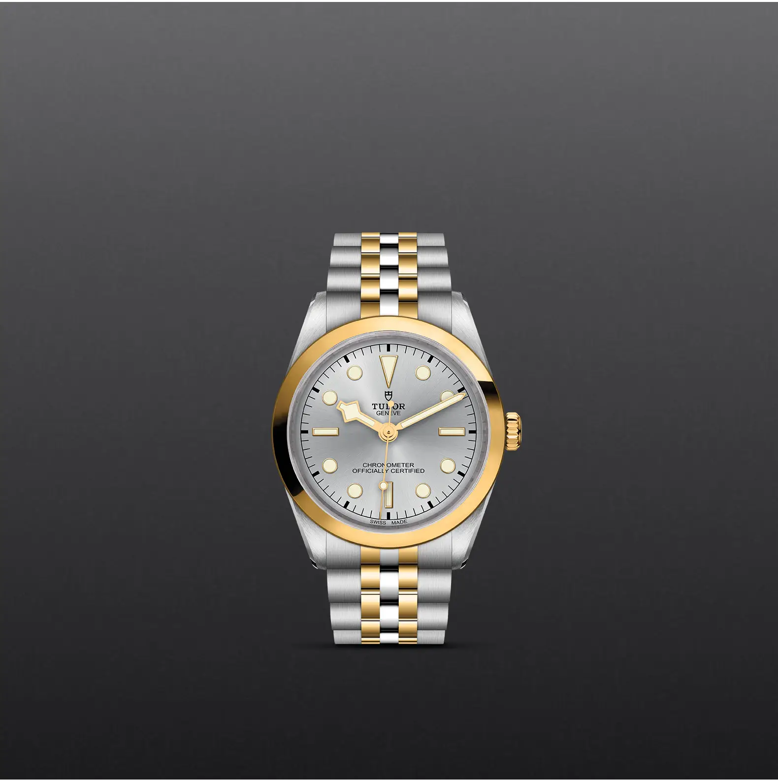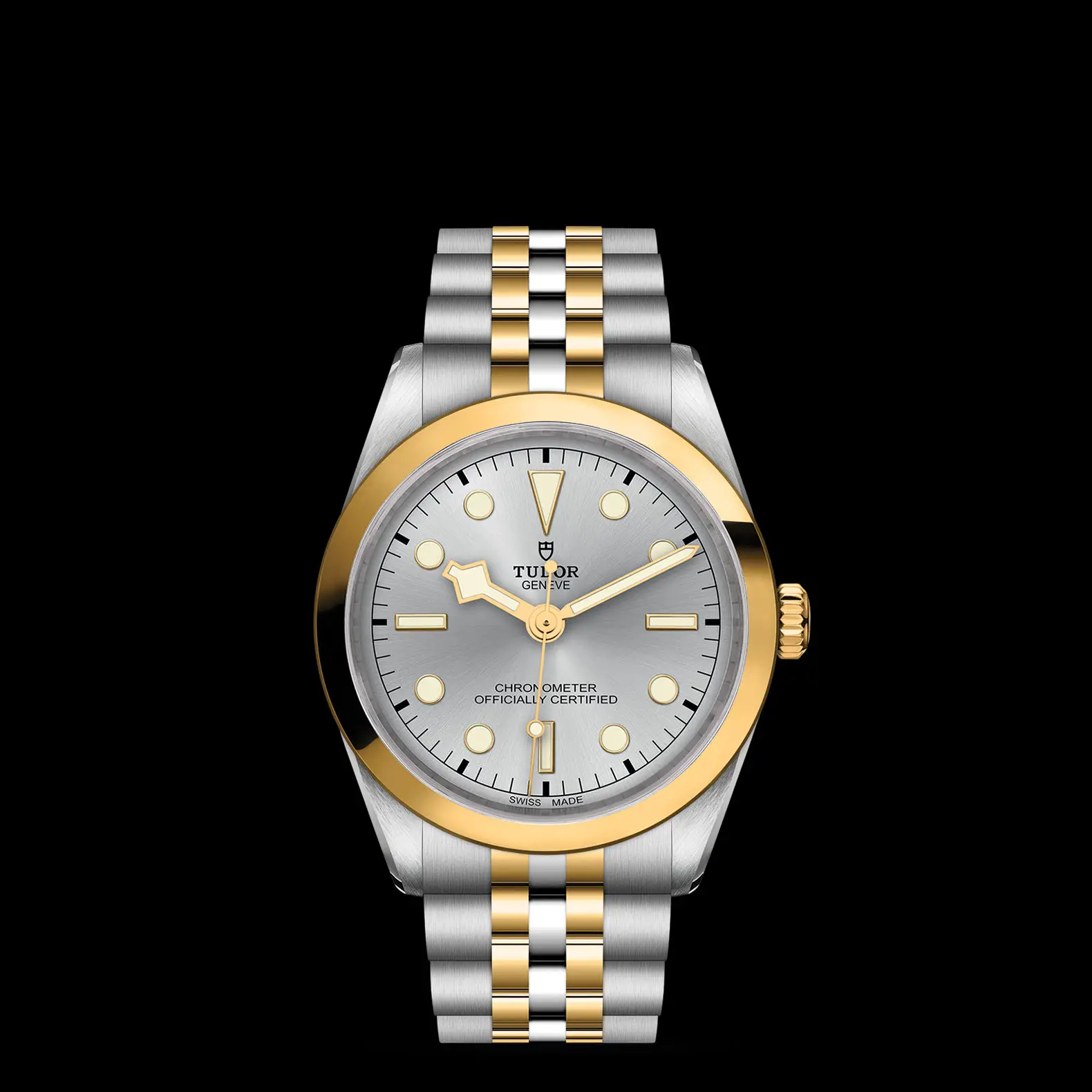 Primeros eslabones centrales de acero o de oro amarillo macizo. Los demás eslabones centrales son de acero o de acero recubierto de 0,2 mm de oro amarillo. Cierre desplegable TUDOR «T fit» con cierre de seguridad. El logo del cierre es de oro amarillo macizo