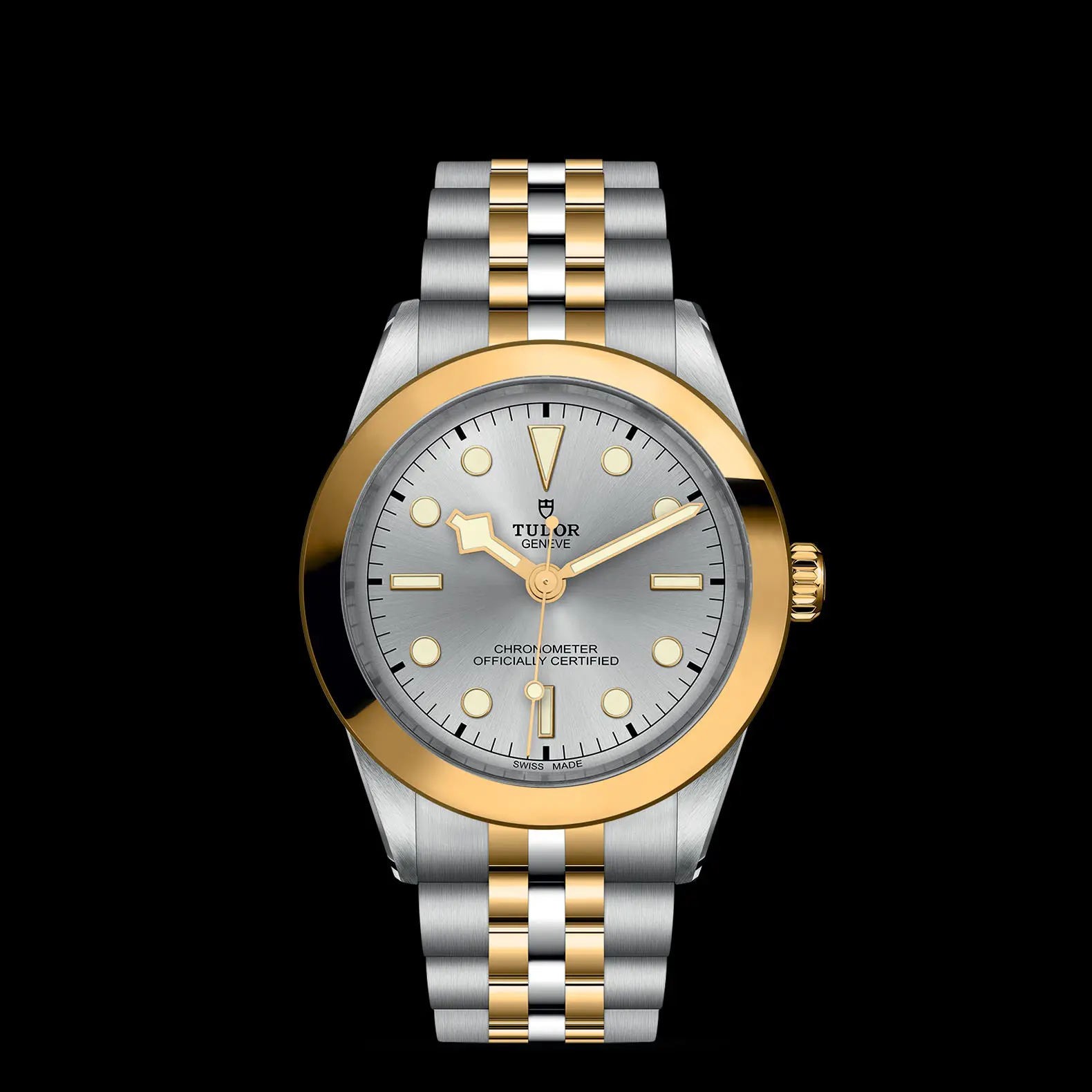 Primeros eslabones centrales de acero o de oro amarillo macizo. Los demás eslabones centrales son de acero o de acero recubierto de 0,2 mm de oro amarillo. Cierre desplegable TUDOR «T fit» con cierre de seguridad. El logo del cierre es de oro amarillo macizo