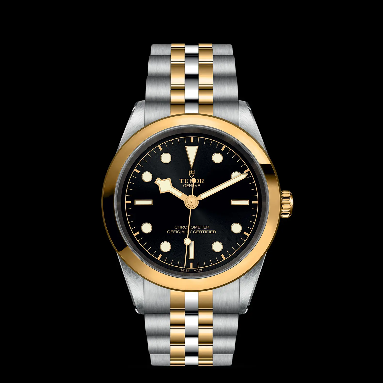 Primeros eslabones centrales de acero o de oro amarillo macizo. Los demás eslabones centrales son de acero o de acero recubierto de 0,2 mm de oro amarillo. Cierre desplegable TUDOR «T fit» con cierre de seguridad. El logo del cierre es de oro amarillo macizo
