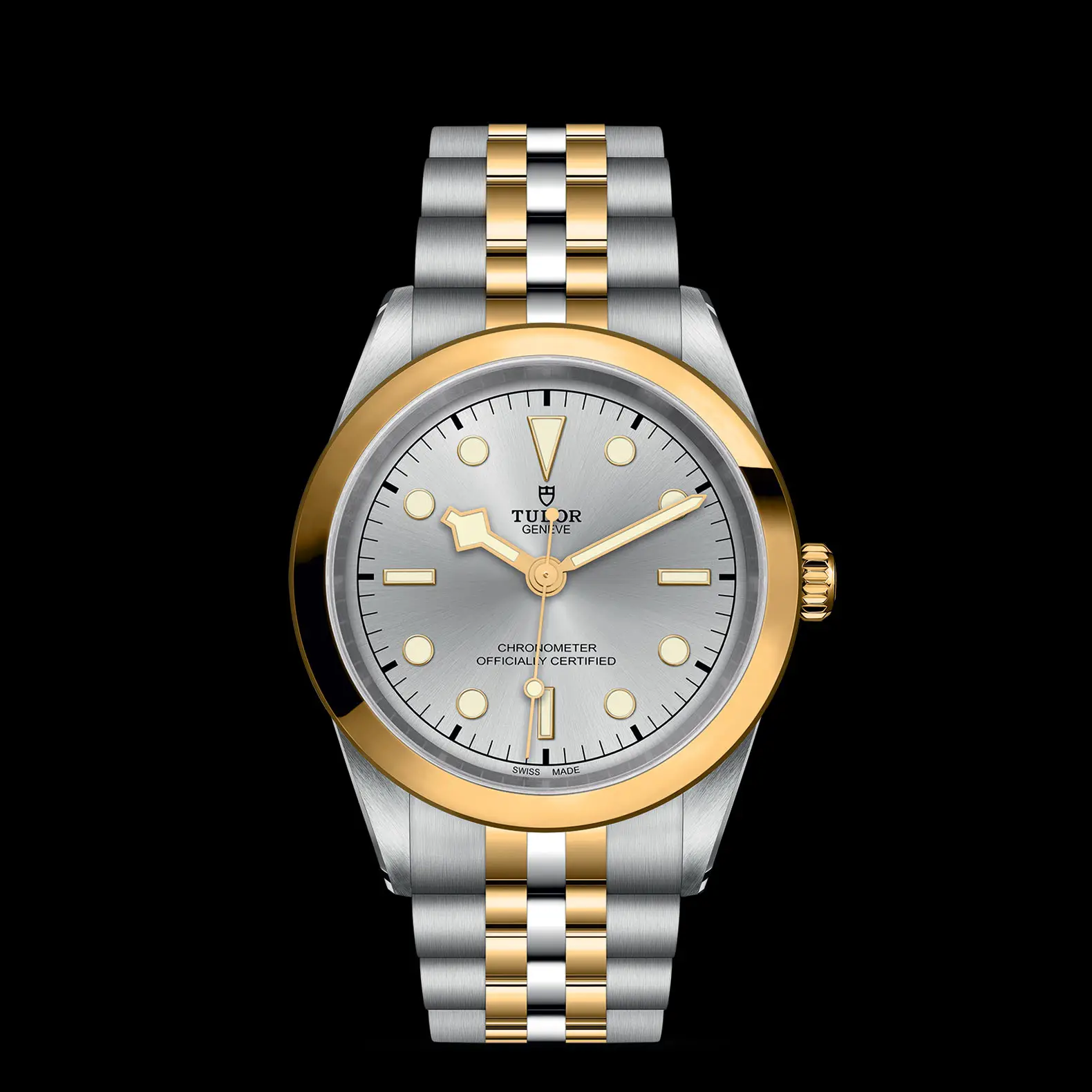 Primeros eslabones centrales de acero o de oro amarillo macizo. Los demás eslabones centrales son de acero o de acero recubierto de 0,2 mm de oro amarillo. Cierre desplegable TUDOR «T fit» con cierre de seguridad. El logo del cierre es de oro amarillo macizo